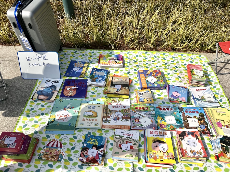 来自复旦二附小的三年级学生陆欣带来了一行李箱的心爱绘本,每套定价10-15元。“这些都是幼儿园时期看的绘本,平时一直没空去挂咸鱼,昨天看到有义卖的招募信息,还剩2个名额,我就赶紧报了名,希望能给到其他爱书的小朋友。”妈妈说。虽然有些不舍得,但听说可以认养市花白玉兰,小女孩还是认真“练摊”。